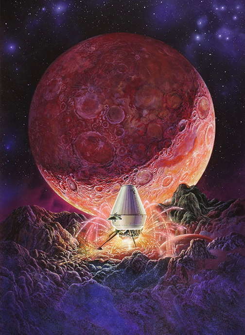 A stylized spaceship lands on a bleak asteroid in this cover painting for a novel set in science fiction writer Keith Laumer’s universe. 10.5×17.5 inches, acrylica and gouache on illustration board, 1989